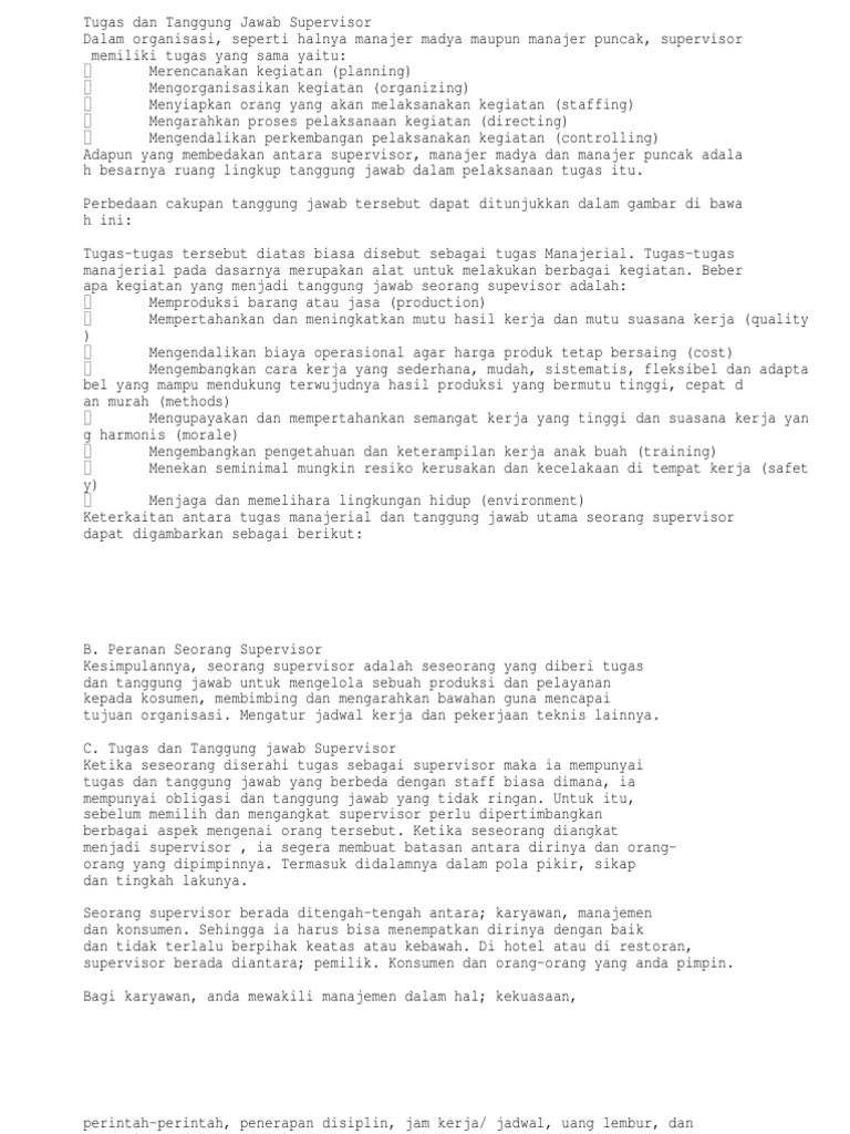 Supervisor adalah jabatan dalam struktur perusahaan yang memiliki kuasa dan wewenang untuk mengeluarkan perintah kepada rekan kerja bawahannya di bawah arahan jabatan atasannya. Supervisor pekerjaan sosial adalah anggota staf yang ahli, didelegasikan untuk mengarahkan, mengkoordinasikan, meningkatkan, dan mengevaluasi kinerja supervisee. Supervisor marketing merupakan supervisor yang bertugas mengontrol dan memonitoring anak buahnya dalam bidang penjualan. Supervisor merupakan salah satu elemen penting dalam keberlangsungan suatu sistem organisasi apakah anda adalah salah satunya? Hasil riset yang dilakukan oleh standford research. Supervisor memiliki peranan penting di dalam tim untuk memajukan perusahaan. A supervisor, or also known as foreman, boss, overseer, facilitator, monitor, area coordinator, or sometimes gaffer, is the job title of a low level management position that is primarily based on authority over a worker or charge of a workplace. Pengertian, pendapatan, tugas, fungsi dan ini rumusguru.com akan memberikan penjelasan tentang supervisor adalah, yuk lihat. Apakah anda sudah memahami apa itu supervisor, tugas dan. Mendengar kata supervisor tentu sangat erat kaitannya dengan visi tujuan utama dari pengawasan tersebut adalah untuk memaksimalkan keuntungan perusahaan. Supervisor adalah seseorang yang diberikan tangung jawab untuk mengontrol dan membawahi kariawan dalam perusahaan. Skill penting seorang supervisor salah satunya adalah softskill, karena softskil sangat penting untuk kesuksesan seorang supervisor atau hrd. Maka secara sederhana, supervisor adalah seorang karyawan yang bertugas.